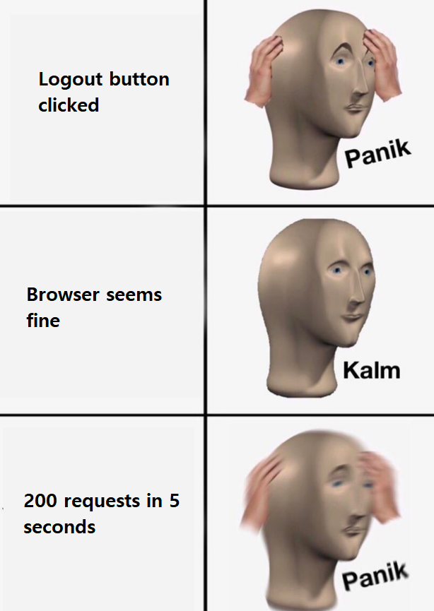 Logout button clicked → Panik. Browser seems fine → Kalm. 200 requests in 5 seconds → PANIK